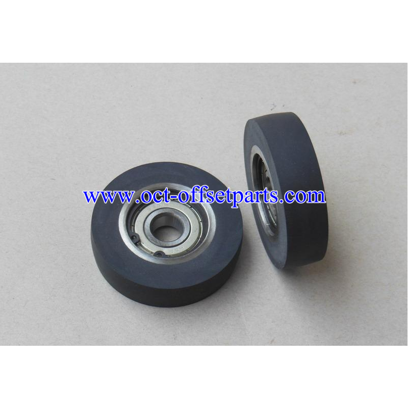 This is a good quality replacement rubber wheel for Komori G-40 machines, replacing part number 764-1211-402. It has an OD of 60mm and includes a 6201Z bearing. Manufactured in Taiwan.